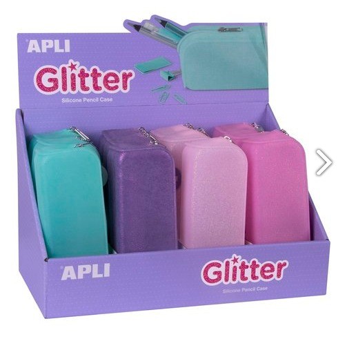 Estuche-portatodo fabricado en silicona de alta calidad con acabado tacto suave y efecto glitter. Tamaño 185 x 75 x 55 mm en 4 colores surtidos: turquesa, rosa, lila y fucsia. Estuches con cremallera, flexibles y moldeables. Resistentes al agua y muy fáciles de limpiar.