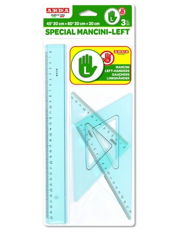 SET DIBUJO PLÁSTICO 3 PCS para zurdos. Regla 30cm + escuadra 20cm + cartabón 20cm