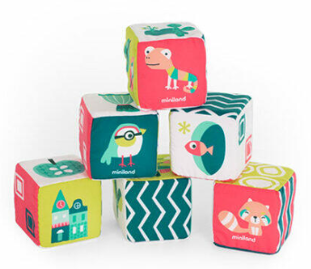 Cubos apilables con colores de alto contraste y patrones de estimulación visual. Cada cubo es un sonajero con tacto suave y esponjoso para agarrar con facilidad. Diseños variados en las caras de los cubos, con dibujos sencillos y reconocibles.